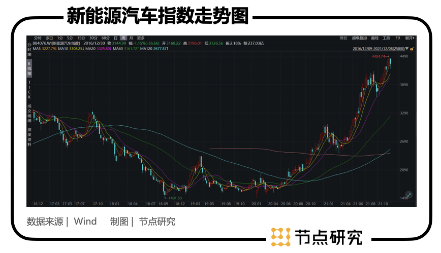 要说2021年最火爆的板块之一,新能源汽车可谓是当仁不让,虽然近5年新能源汽车从2018年底开始有明显起色,但真正的主升浪是从2020年年中开始,除了间歇性回调外,一直保持大幅上升。尤其是在今年大盘震荡、许多以往的热门板块都表现不佳的情况下,新能源汽车板块的强势上涨更显珍贵。