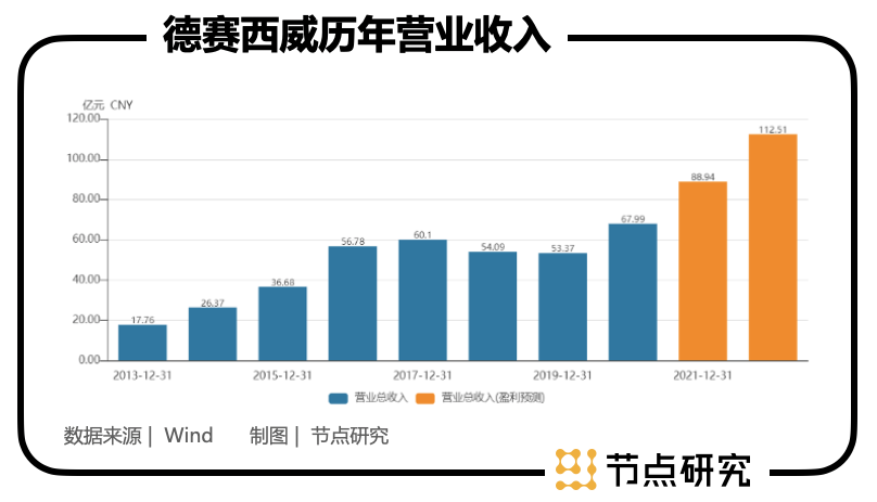 从德赛西威历年营业收入可以看出,近八年来德赛西威基本保持了营业收入的持续增长,但在2018~2019年遭遇了下滑,后随着新能源汽车迎来新的格局、战略调整的进一步深化,2020年扭转了营收增长率,并且未来一两年的预期也维持较快增速。