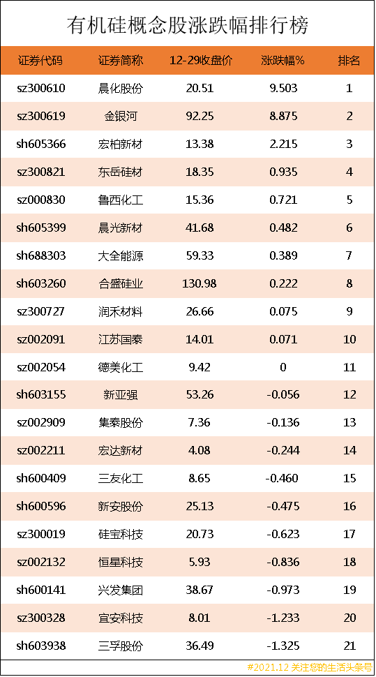以上就是为读者们带来的有机硅概念股涨跌幅排行榜的相关信息,本文是根据有关数据及近期事件所撰写分析文章,并不构成投资建议,据此操作,风险自担!(本文属于非商业性文章)