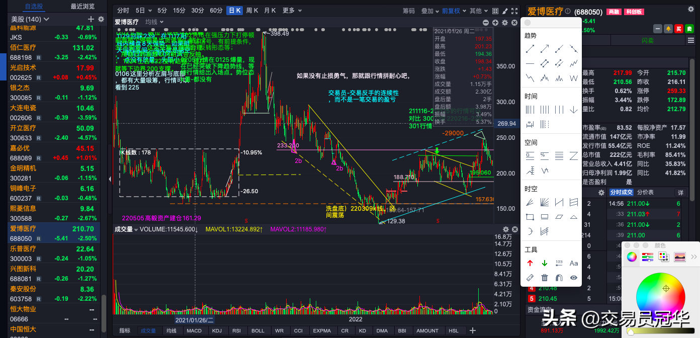 我老师说培训你们成为交易员,当你们能1年收益50%的时候;我们就可以分手,你们就可以自己在A股,港股 ,美股里面做交易。如果你们听到50%交易你们说满意满意,其实不是这样的,比如:你的本金只有10w,1年收益5w你们肯定不满意;但是本金100w或更多,1年收益50w,按照现在社会的开支一般的家庭用这50w肯定可以满足所有的开支,本金还可以利滚利的增长。我跟着我老师学习2年的时间,技术,心理,执行力都有一定的提高,真的印证我老师说的那句话,机构,主力都是狼心狗肺,他们会给你希望让你赚钱,然后把你按在地板上摩擦。因为机构洗盘会洗到前面起爆点那个位置,今年(2022年)主力洗盘洗得有点狠,我到现在也亏损,基本上把去年赚的大部分都吐回去了。因为我今年做交易做得不顺,没有地方与人闲聊,所以在这里吐槽几句,祝所有立志要在交易这条路走顺走通奋斗的路上加油。我就在下面简单叙述这两年单独做交易的心情吧;