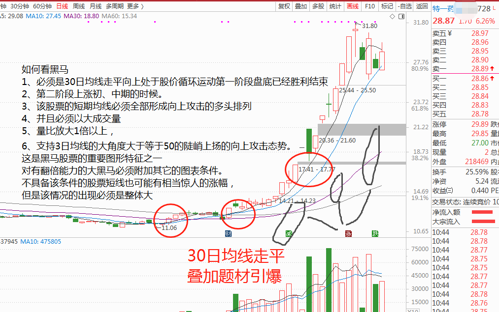 1、 必须是30日均线走平向上处于股价循环运动第一阶段盘底已经胜利结束;