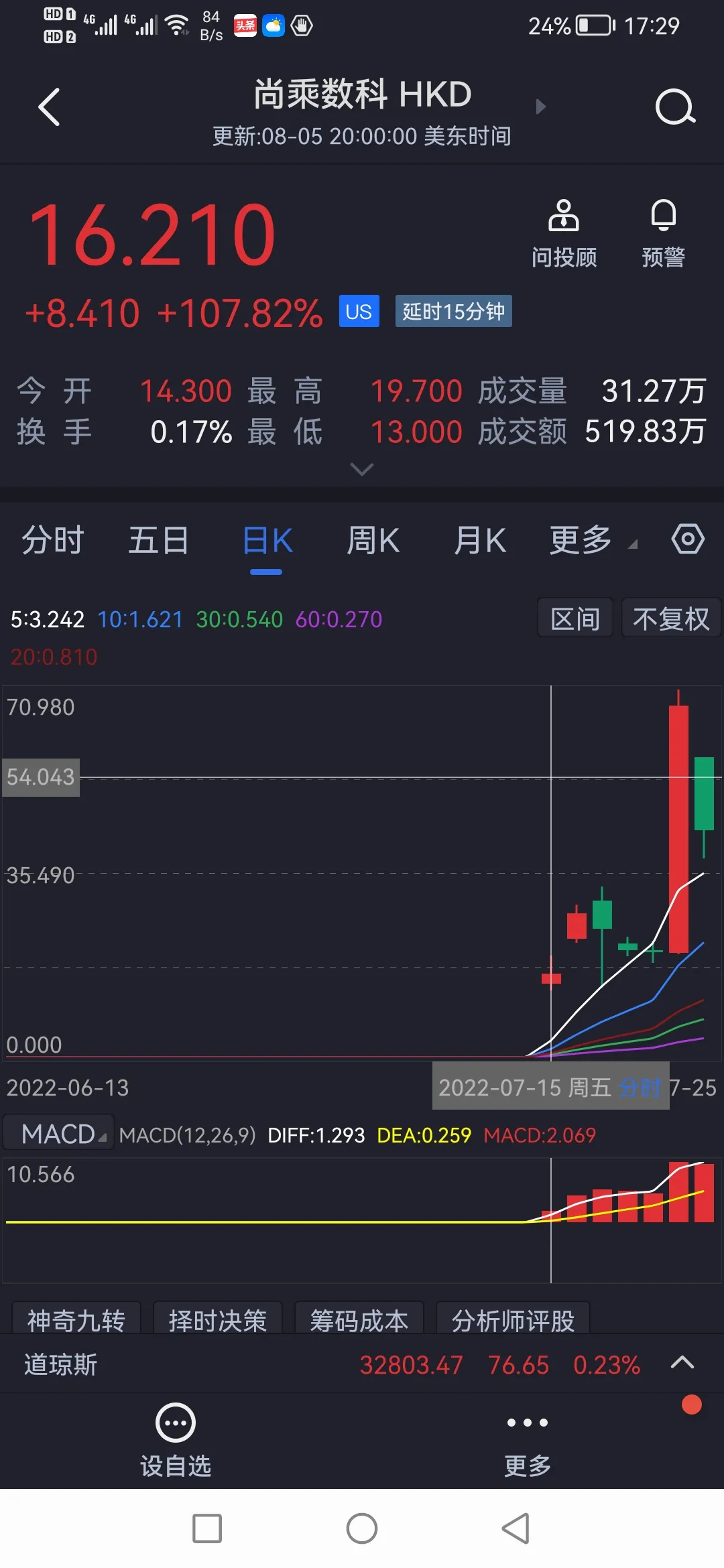 这支股票在7月15日上市的第1天。发行价7.8元,开盘于14.3元,开盘后最低价格13元,收盘在16.21元。